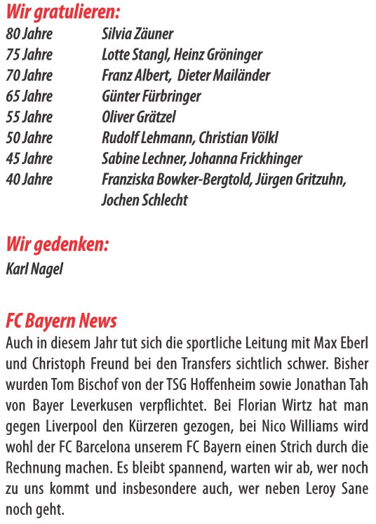 Liebe Mitglieder, herzlichen Glückwunsch zu 2 Meistertiteln den Fußball-Damen und unseren Fußball-Herren, es geht doch! Nachdem uns der Saisonrückblick im letzten Jahr doch sehr schwer gefallen ist, sieht das in diesem Jahr wieder wesentlich besser aus. Wir durften sowohl die Meisterschaft der Damen als auch die der Herren bejubeln! So wollen wir unseren Verein sehen und mit ihm gemeinsam vom Rathausbalkon jubeln – es hätte sicher niemand etwas dagegen, wenn wir daraus wieder einen Serientermin machen. Mit ihrem ersten Double ist gerade auch den Damen etwas Historisches geglückt. Für die neue Saison ist das auch den Männern zu wünschen, denn im Pokal hat sich der FC Bayern in den letzten Jahren wahrlich nicht mit Ruhm bekleckert. In der CL blieb beim Finale„Dahoam“ leider nur die Zuschauerrolle. Im Viertelfinale war nach hartem Kampf gegen Inter Mailand leider Schluss. Zu viele Unzulänglichkeiten gerade auch in der Defensive und teilweise ein Chancenwucher sorgten ebenso dafür, dass man vorzeitig die Segel streichen musste, wie große Verletzungsprobleme in der entscheidenden Phase der Saison. Mit viel Wehmut und ein wenig Traurigkeit verabschieden wir uns von einem ganz Großen, den es so nie wieder beim FC Bayern geben wird. Thomas Müller hat Einzigartiges geleistet, er hat diese Mannschaft und den Verein geprägt. Nun ist es die Aufgabe der nächsten Generation die Lücke zu schließen. Danke Thomas Müller!